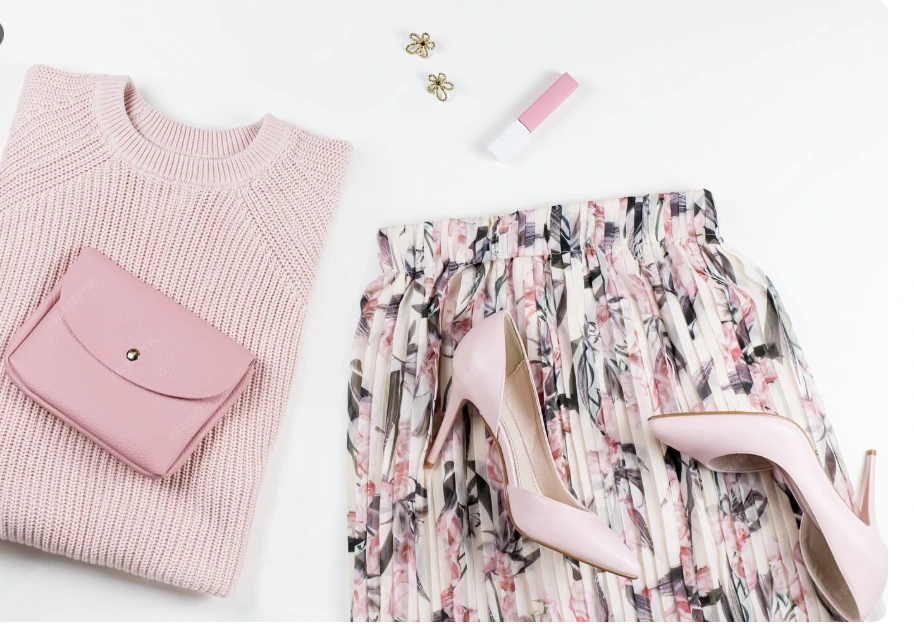 Conjunto feminino elegante com camisola de manga comprida em rosa, Saia, camisola, sapatos e acessórios. Ideal para o outono/inverno e para o trabalho.